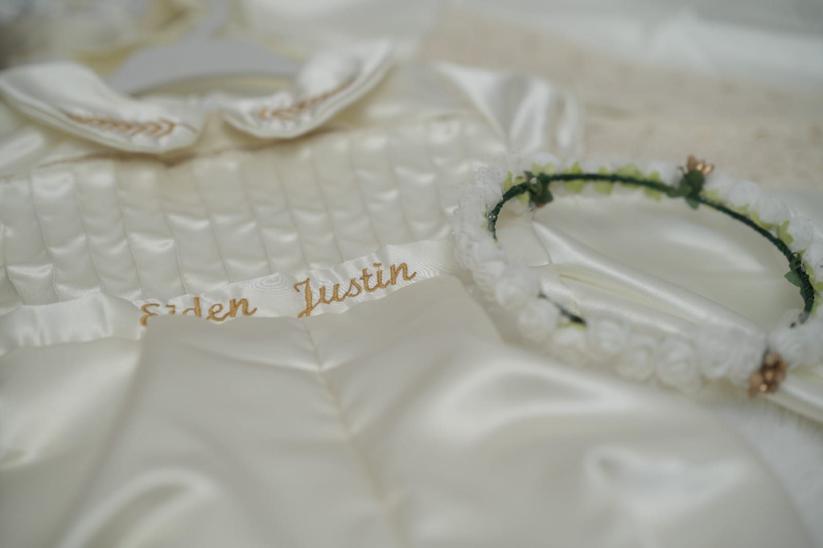 Satin romper paired with a matching shrug. The inner romper features delicate leaf embroidery on the collar, and your baby’s name can be added for a personalized touch.