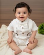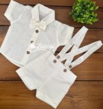 Classic linen baptism set with suspenders and bow tie – timeless and elegant.