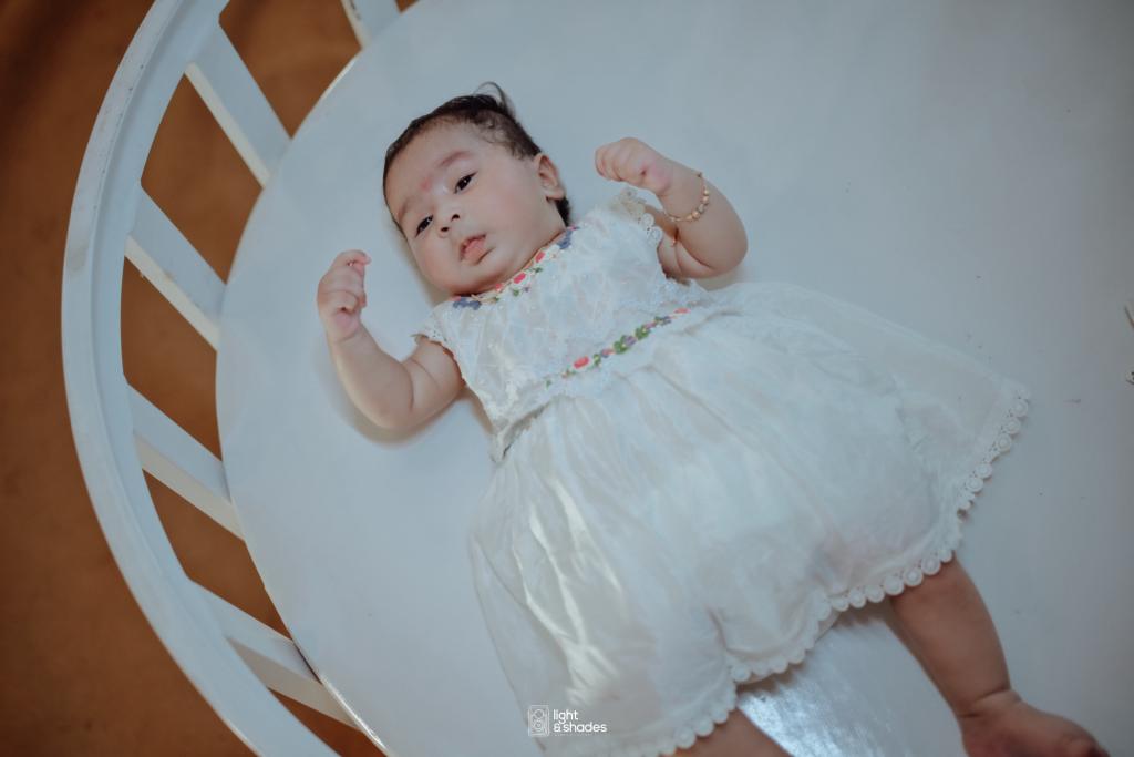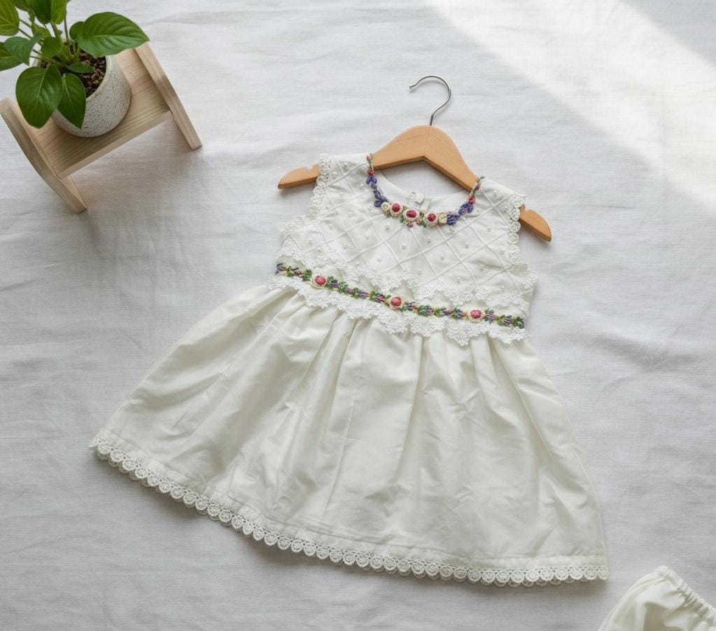 Baby dress adorned with intricate hand embroidery and lace detailing – a timeles piece for celebrations and photoshoots.